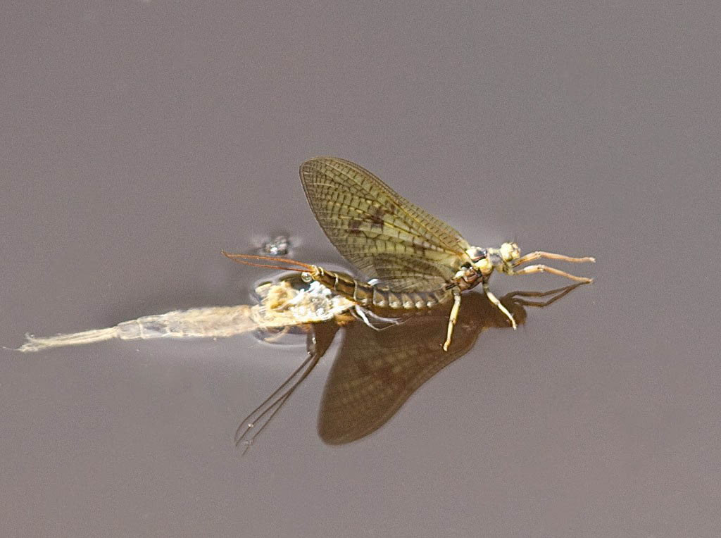 Mayflies have a unique adult life as they emerge in an immature form called a sub-imago which is usually referred to as a 'dun,' or 'adult,' and later molt into their sexually mature form known as an imago which is almost always called a 'spinner.' Some mayfly species emerge en masse creating prolific, blanket hatches, while others emerge more sporadically, popping off here and there throughout the day. The spinners mate, often in midair, the females lay their eggs, and they die. A number of species create blanket spinner falls as they form mating swarms and fall to the water's surface in the thousands. This two-part adult phase of their life cycle occurs in one day for most species.